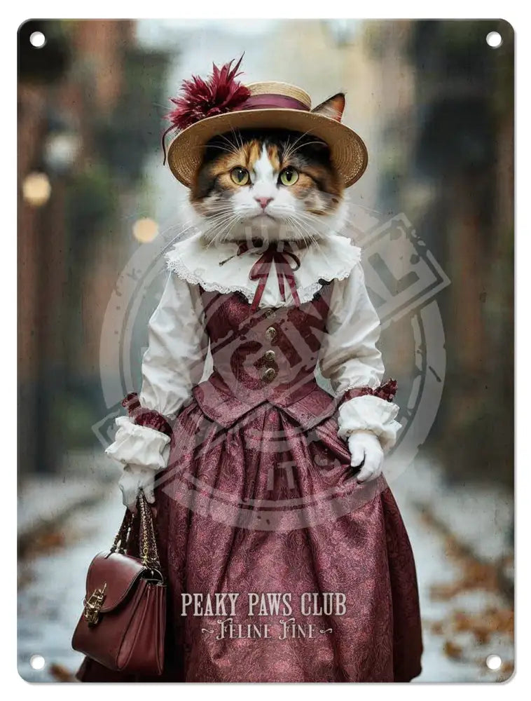 PEAKY PAWS CLUB - FELINE FINE - Calico Cat Pink Dress Mini Metal Sign 15cm x 20cm Metal Signs