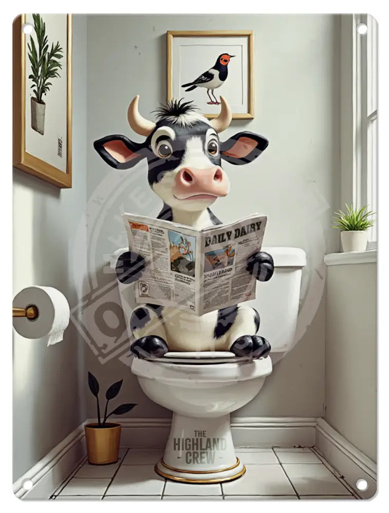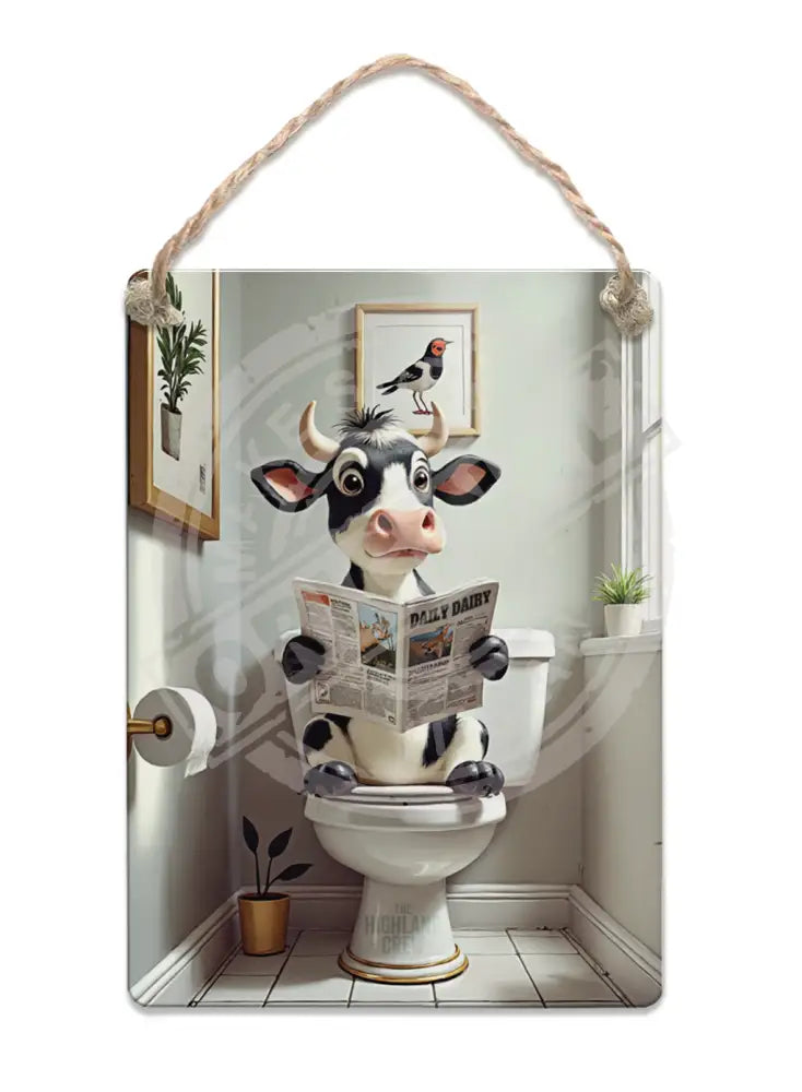 HIGHLAND CREW - DAIRY COW - On Toilet White Dangler Metal Signs